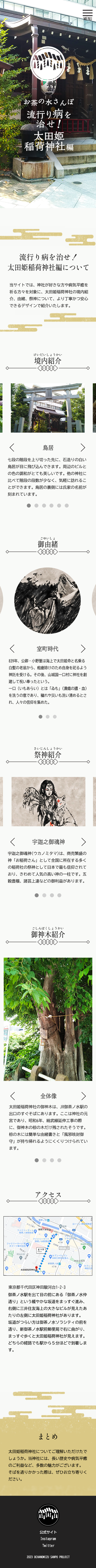 神社らしさを表現するため、サイト全体に和風の意匠を取り入れ、神社の歴史や祀られている神様について丁寧に紹介しています。